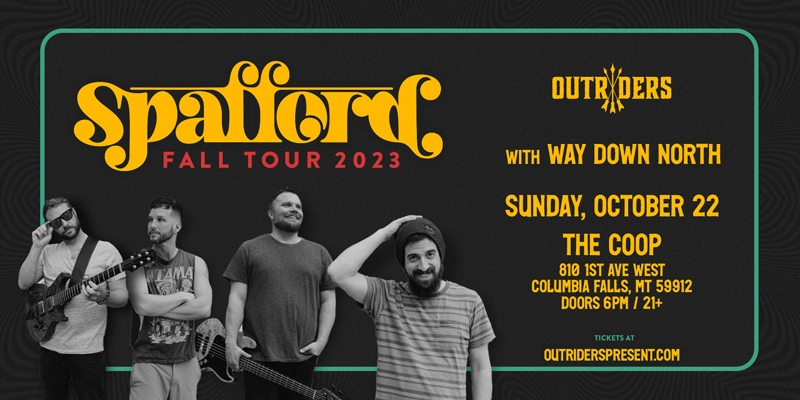Outriders Present Spafford with Way Down North at The Coop October 22, 2023 SPAFFORD WAY DOWN NORTH The Coop Columbia Falls, MT DOORS: 6PM | 21+ SPAFFORD: Website: https://spafford.net/ Facebook: https://www.facebook.com/spaffordmusic/ Instagram: https://www.instagram.com/spaffordmusic/ Spotify: https://open.spotify.com/artist/7fA0IDinGo27lmOeGy6oGV?si=JPnye3ZeQSOjUnRDGf_JAw OUTRIDERS PRESENT: Website: https://www.outriderspresent.com/ Instagram: https://www.instagram.com/outriderspresent/ Facebook: https://www.facebook.com/outriderspresent/